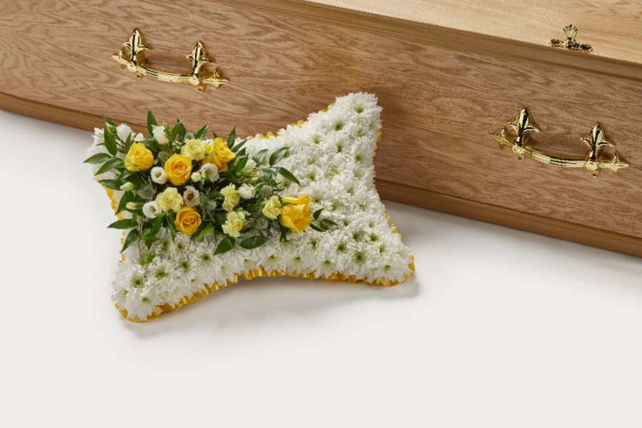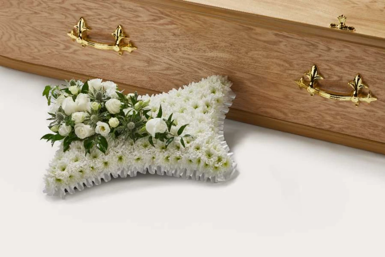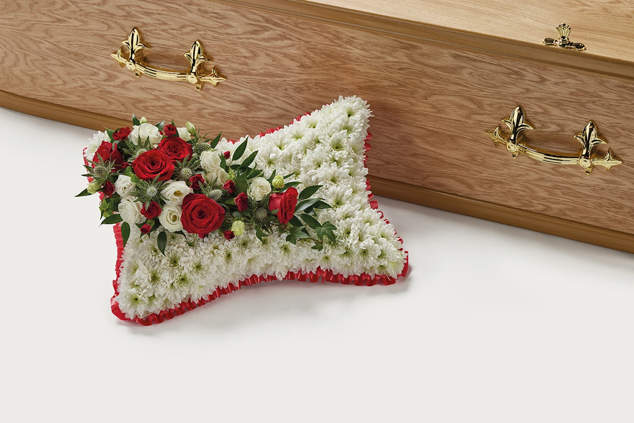 A peaceful, pillow-shaped arrangement of hand-picked double chrysanthemum, roses, lisianthus, carnation, thistle and foliage with a choice of decorative ribbon or no ribbon.